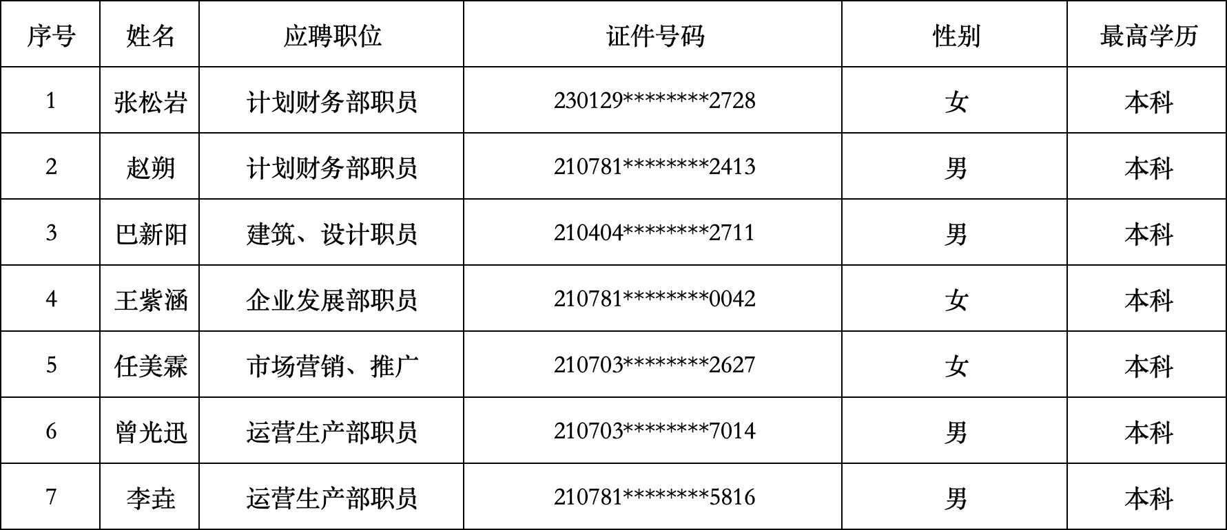 錦州海通實(shí)業(yè)有限公司擬錄用人員公示名單